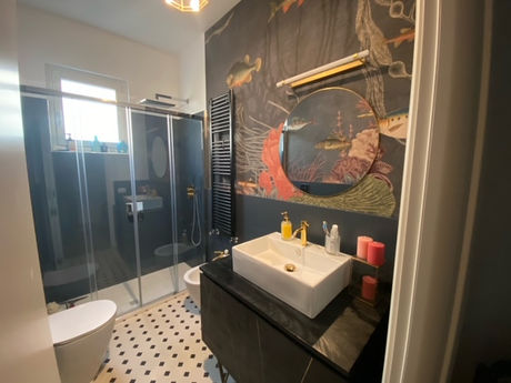 Il bagno è stato ridistribuito e rinnovato con un pavimento in gres porcellanato che riprende la pavimentazione del soggiorno, in formato più piccolo, un rivestimento color bronzo a tutta altezza e la pavimentazione della doccia realizzata completamente in muratura e rifinita con un mosaico in tonalità con il rivestimento.